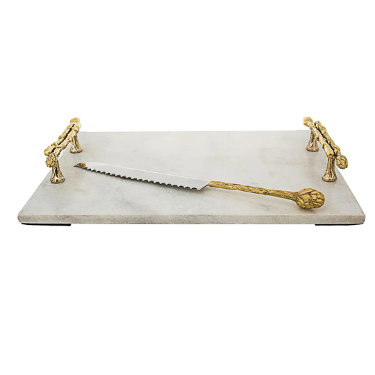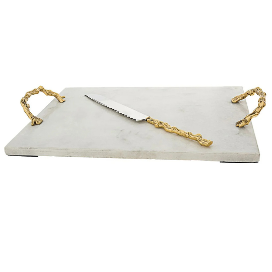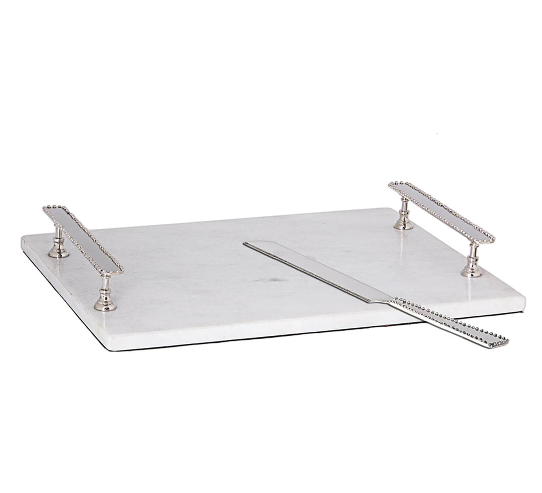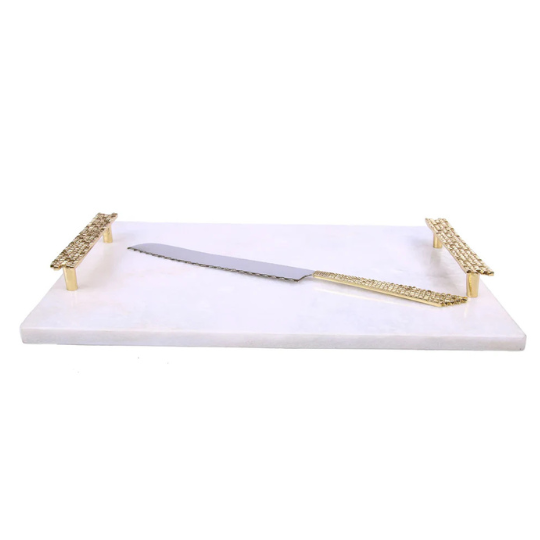 15.25"L White Marble Challah Tray With Mosaic Handles
