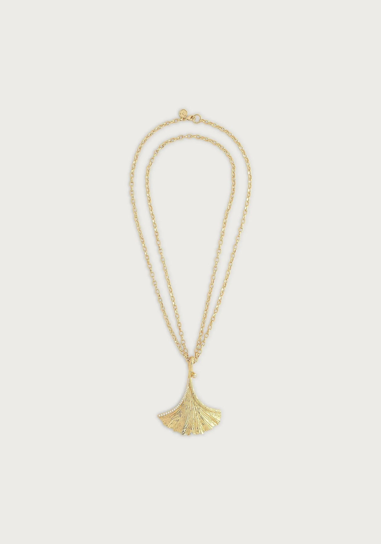This necklace features an artfully sculpted ginkgo leaf with a twisted stem that serves as its own bale. The pendant is crafted in 18k gold dipped brass, accented with shimmering hand set crystals. The 36” chain can be worn doubled or long, making it a versatile piece for any occasion or outfit.
