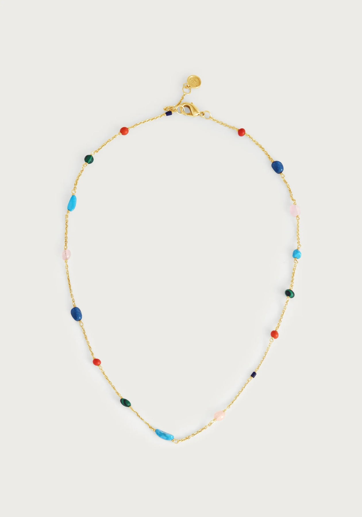 The Milos Chain Necklace offers effortless elegance with its lustrous gold plating beautifully interspersed with randomly placed natural stones including lapis lazuli, turquoise, rose quartz, malachite, mother of pearl, and coral that create a stunning tapestry of coastal colors. Perfect for wearing solo as a statement piece or paired with a single charm, this versatile length captures the essence of understated Mediterranean sophistication in every carefully crafted link.